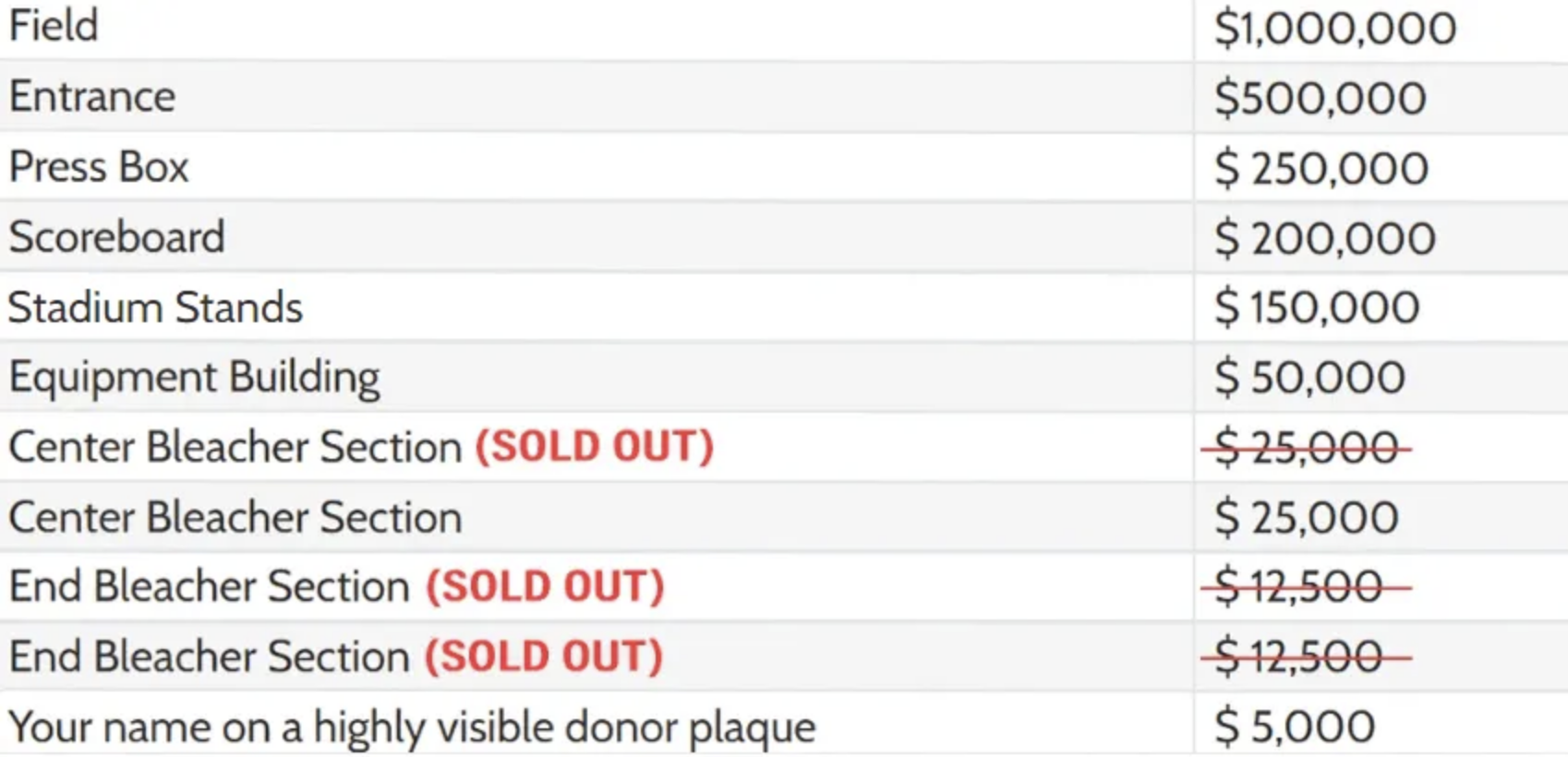 *All naming opportunities may be paid over a 5-year time frame.